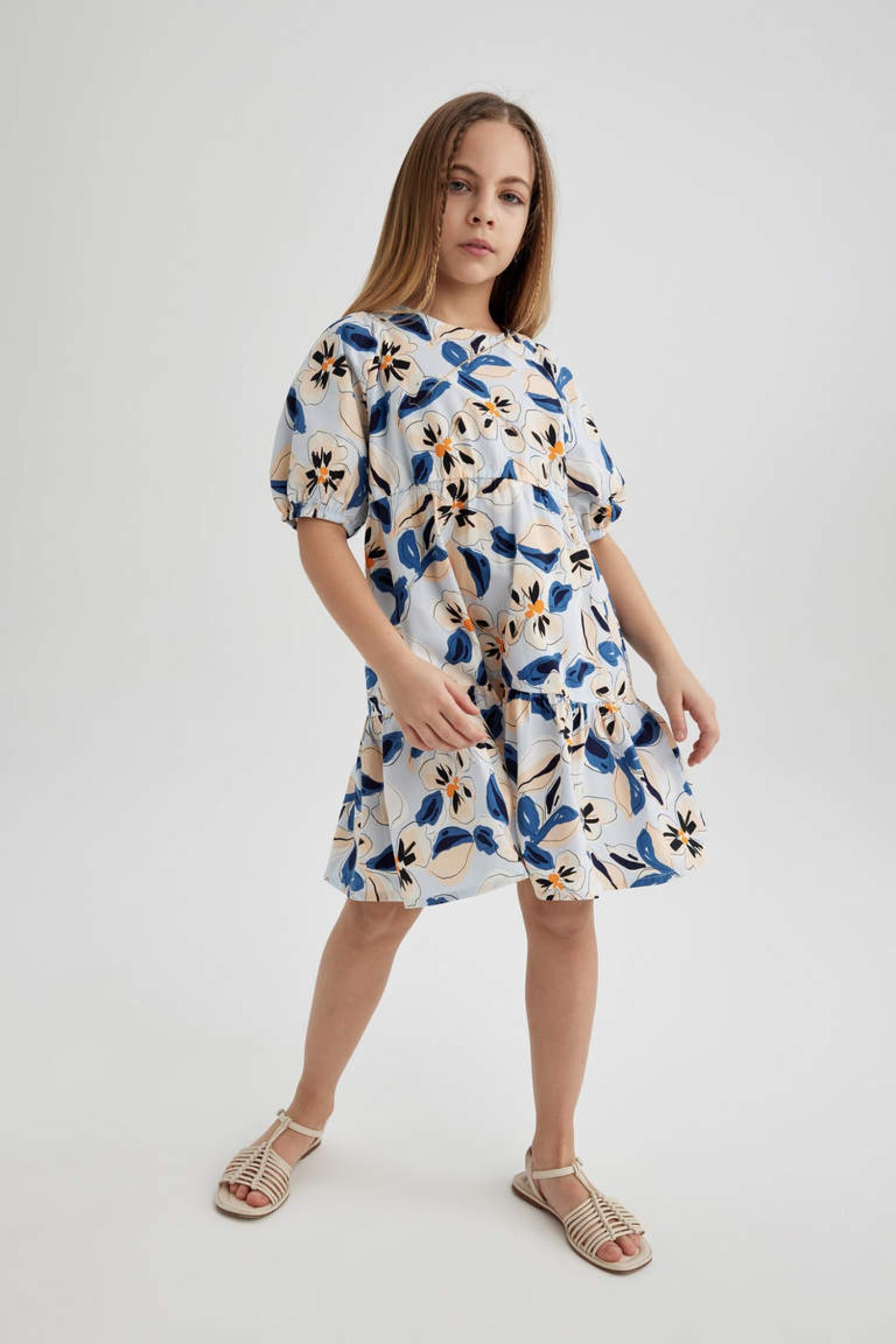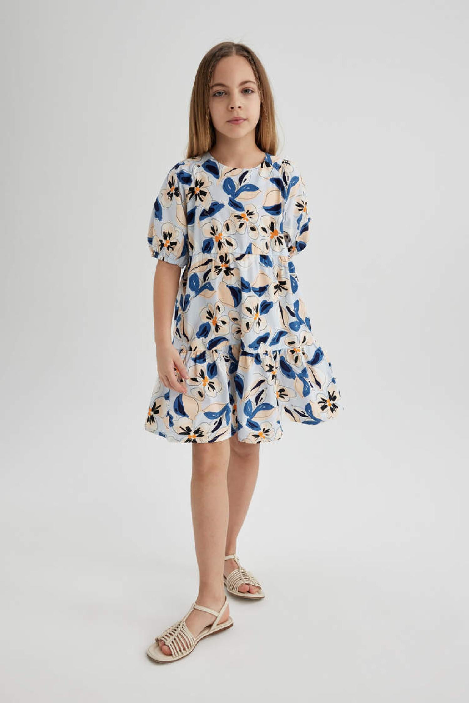 Defacto C0707A8 Kız Çocuk Desenli Kısa Kollu Poplin Elbise