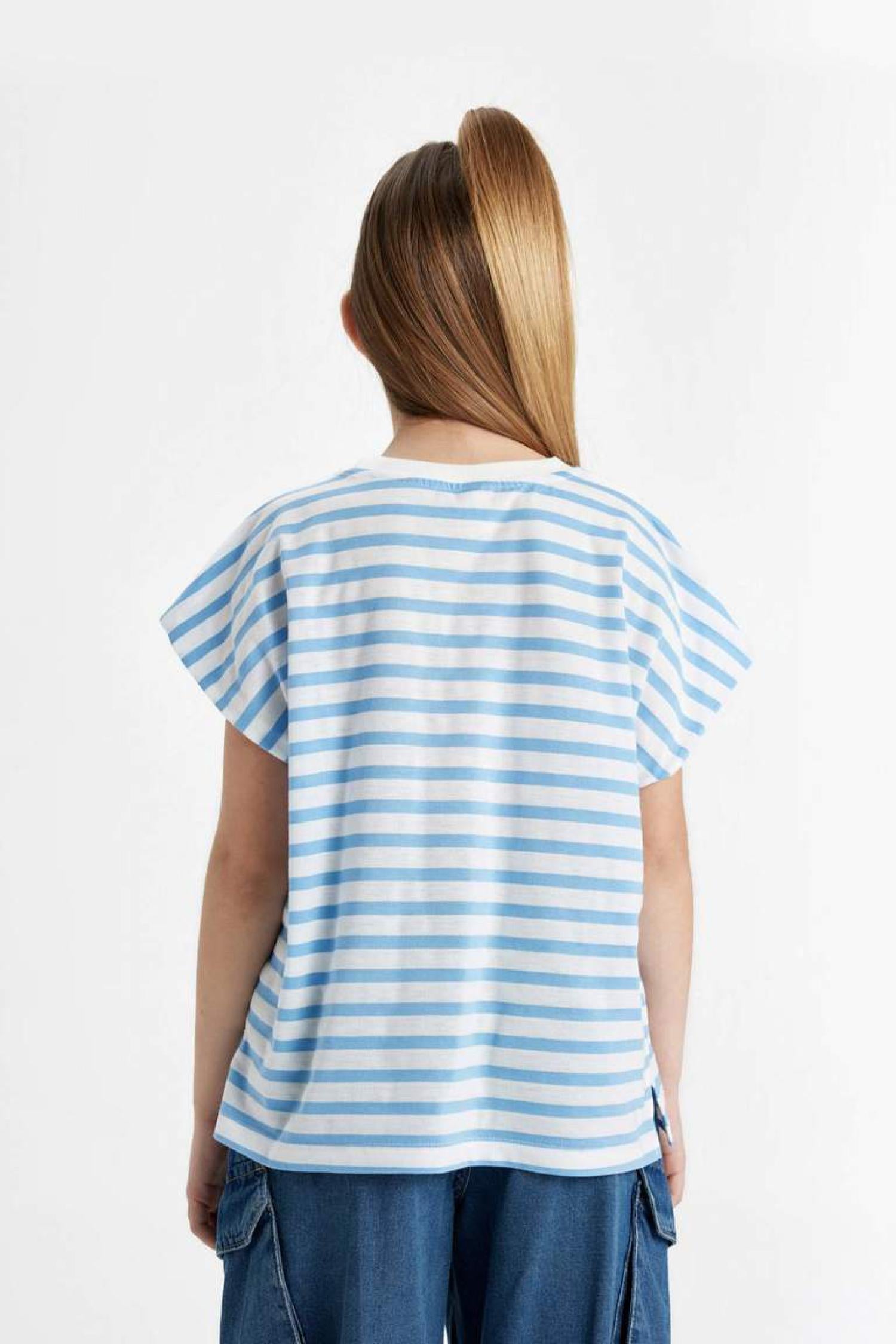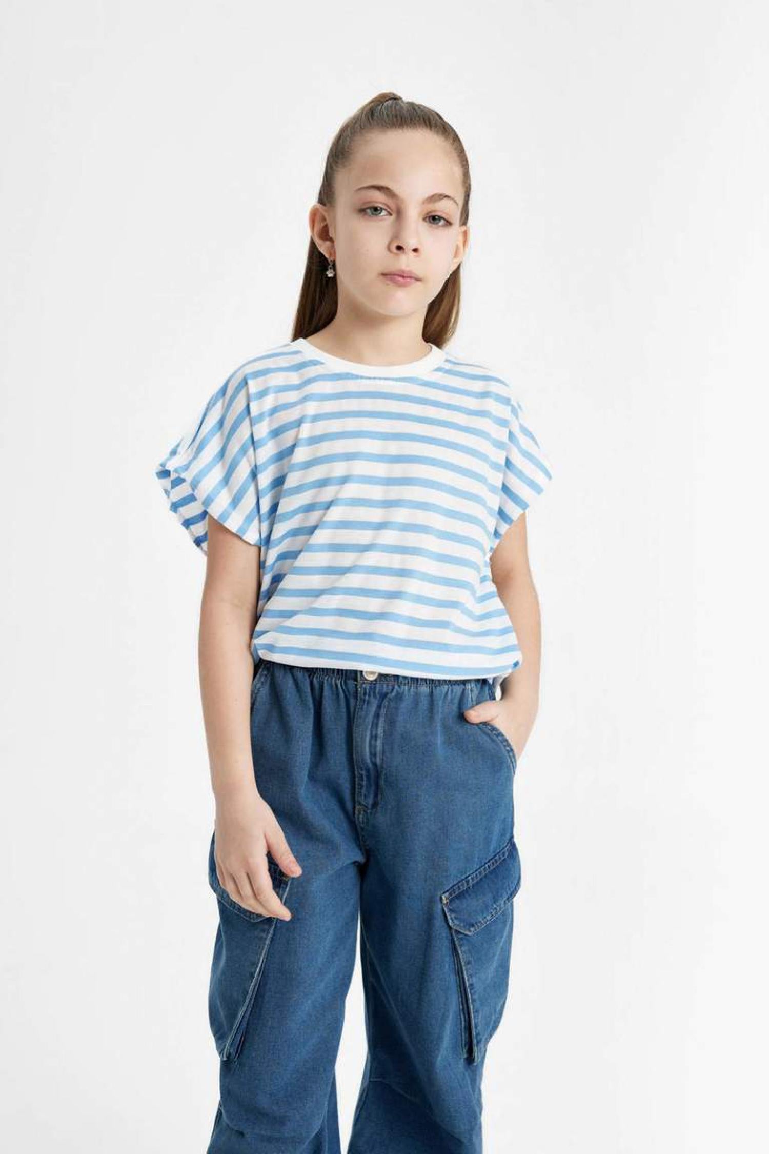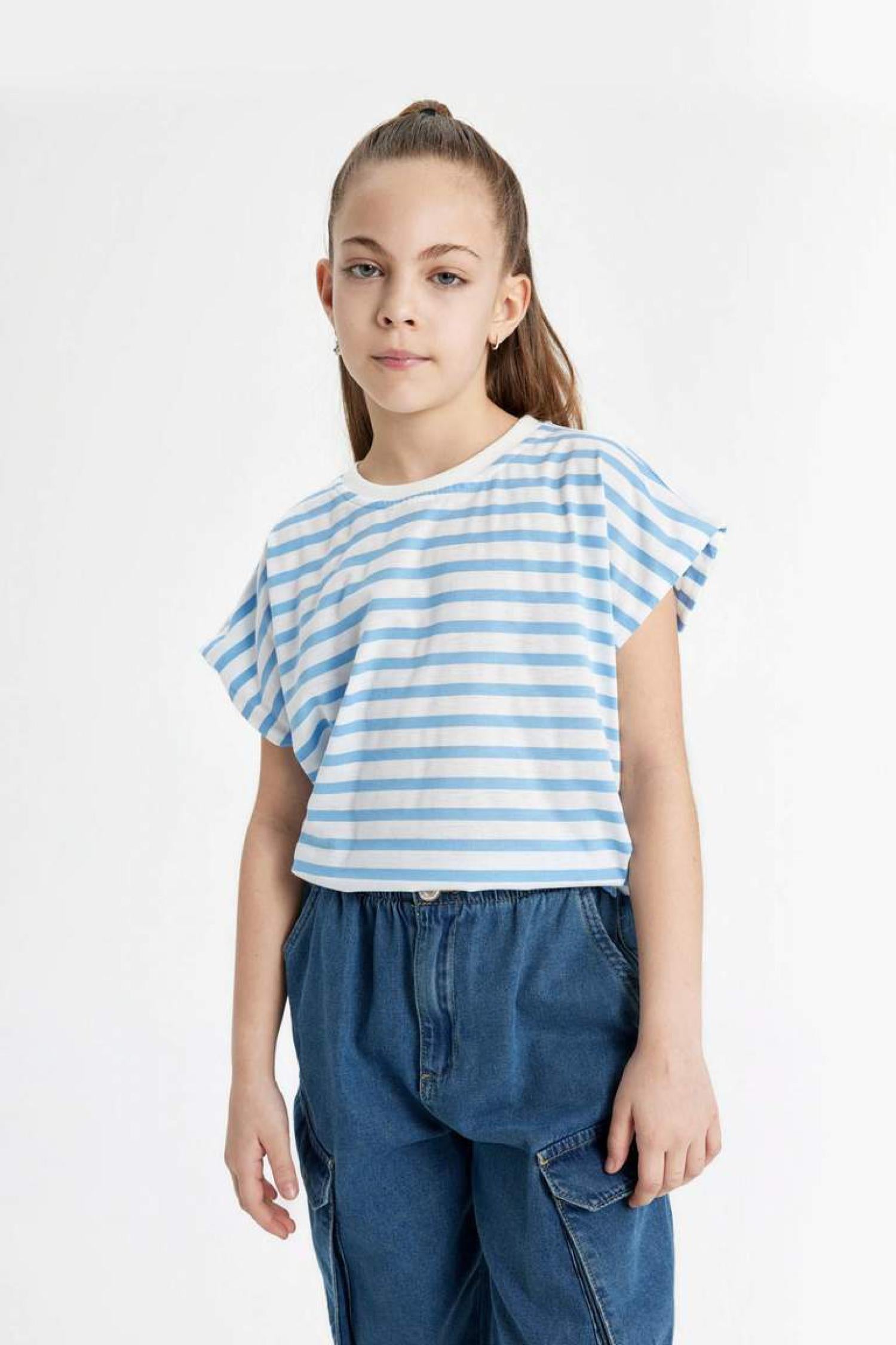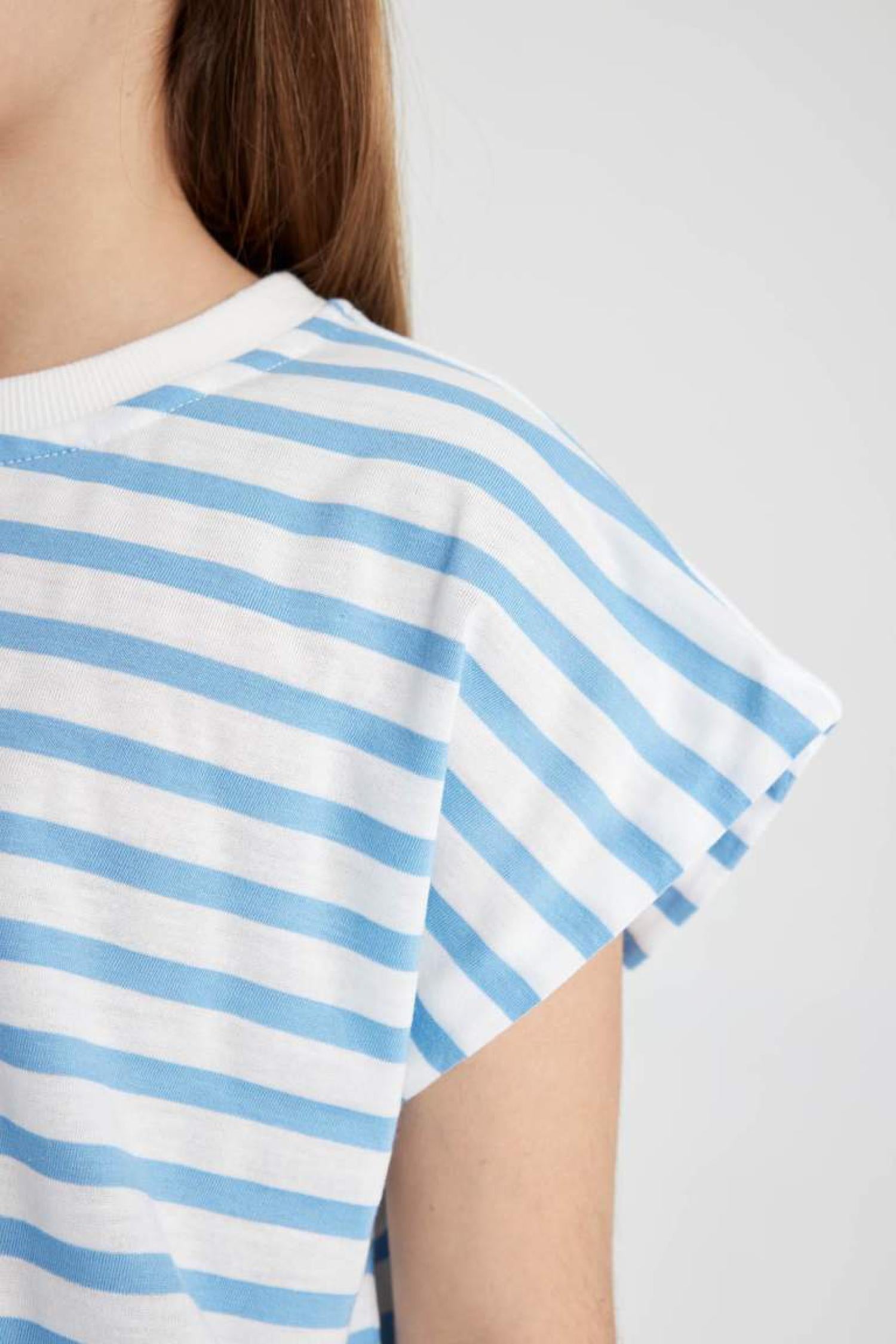 Defacto B6697A8 Kız Çocuk Oversize Fit Jersey Çizgili Kısa Kollu Tişört