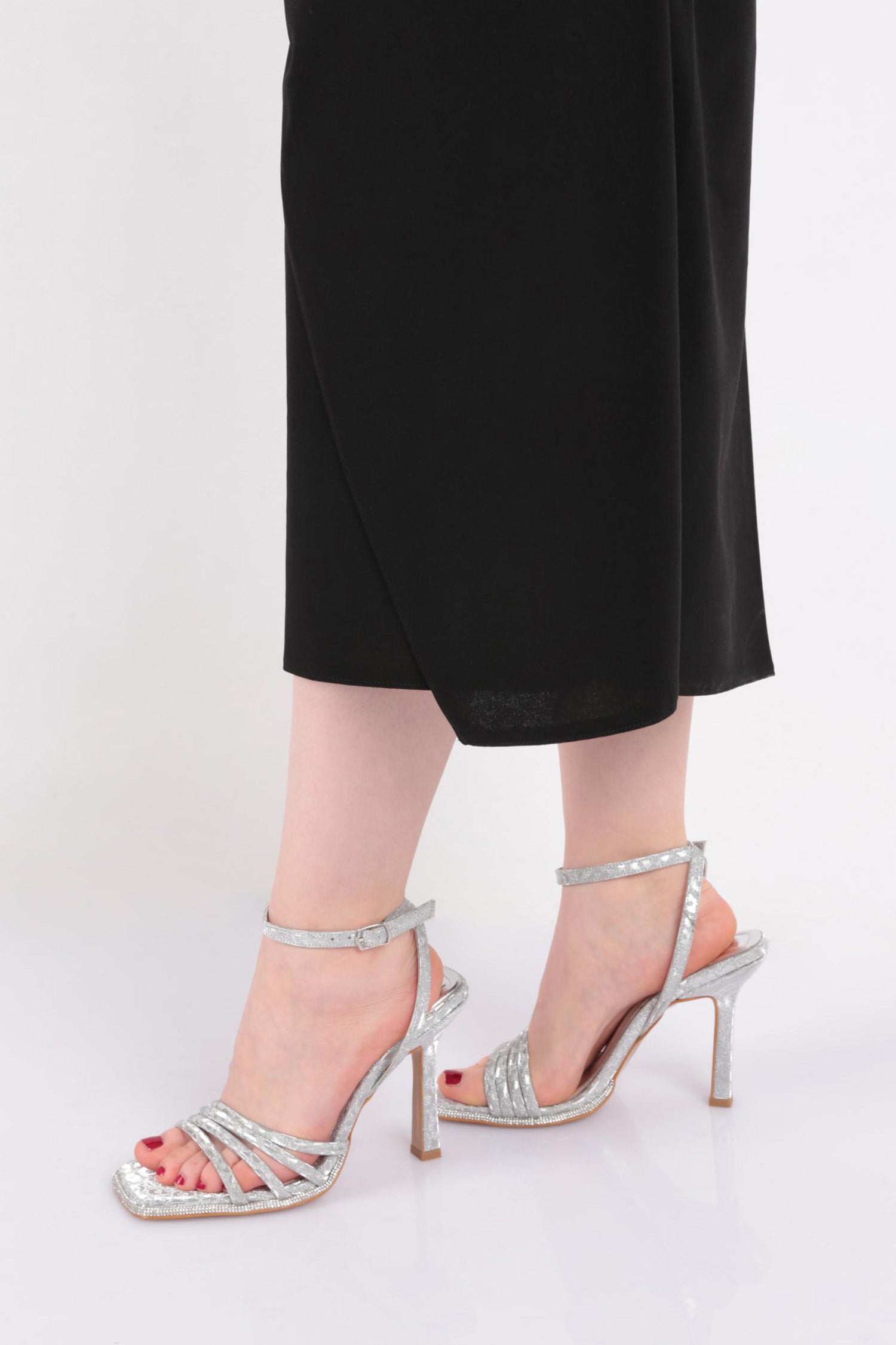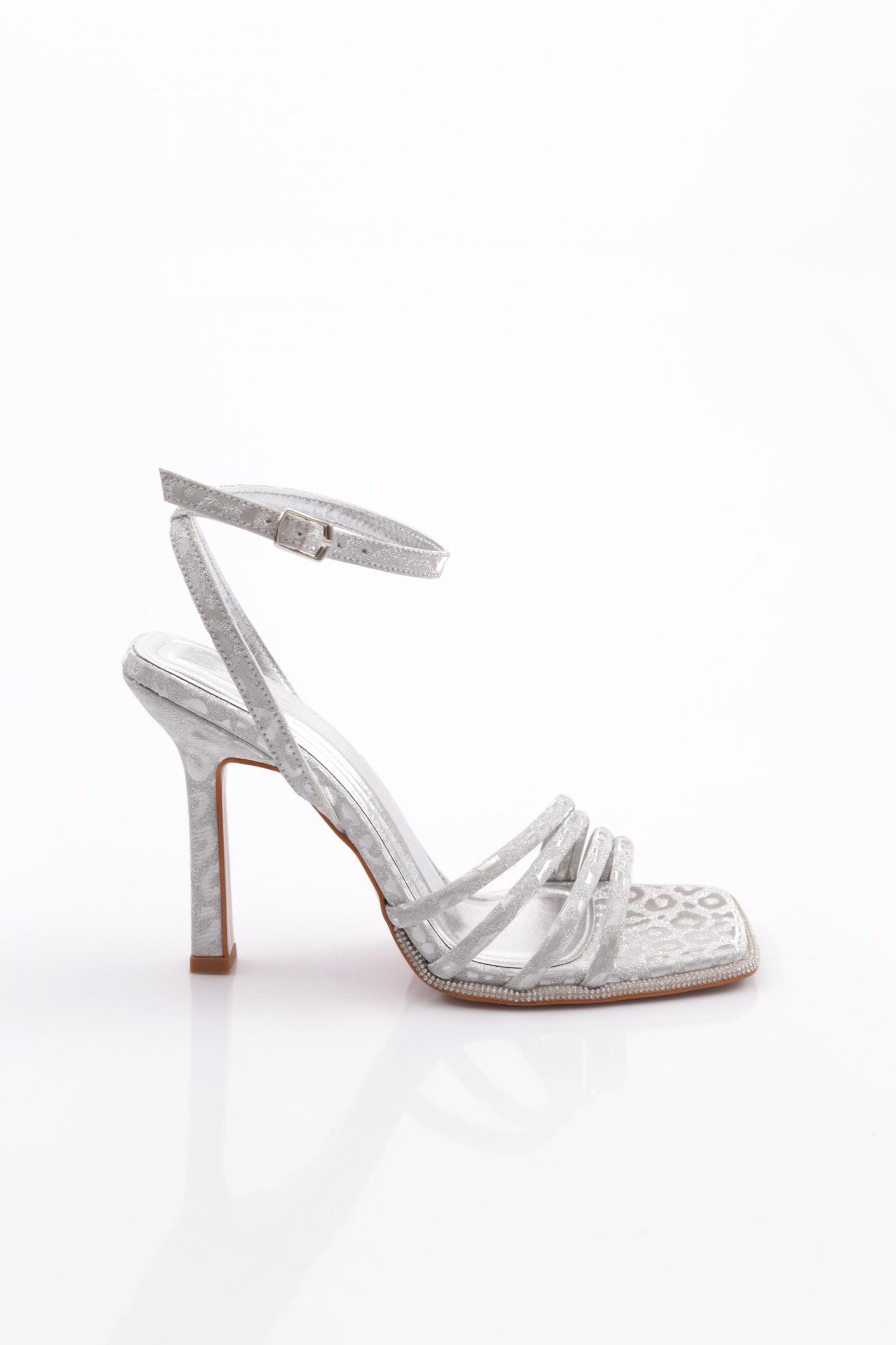 Kadın Sıralı Bantlı Silver Taş Detaylı Bilekten Kemer Bağlamalı Topuklu Ayakkabı 313433210